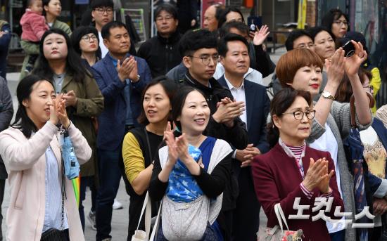 20일 강원 춘천 중앙로에서 열린 더불어민주당 문재인 대선 후보 집중 유세에서 유권자들이 연설을 들으며 박수치고 있다.