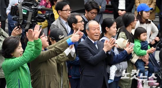 20일 강원 춘천 중앙로에서 열린 더불어민주당 문재인 대선 후보 집중 유세에서 유권자들이 연설을 들으며 박수치고 있다.