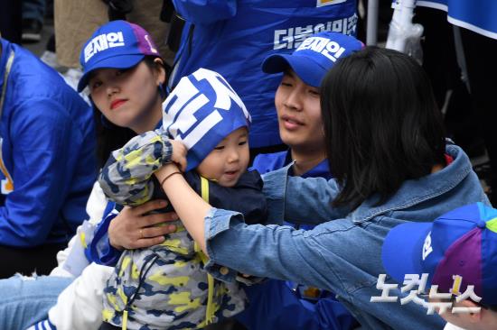 20일 강원 춘천 중앙로에서 열린 더불어민주당 문재인 대선 후보 집중 유세에서 한 어린이가 '문재인'이라고 적힌 두건을 쓰고 있다.