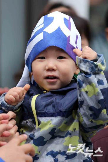 20일 강원 춘천 중앙로에서 열린 더불어민주당 문재인 대선 후보 집중 유세에서 한 어린이가 '문재인'이라고 적힌 두건을 쓰고 있다.