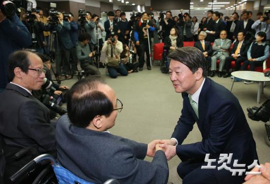 국민의당 안철수 대선후보가 20일 오후 서울 영등포구 여의도 이룸센터에서 열린 '모두를 위한 장애인 복지' 간담회에서 참석자들과 인사를 나누고 있다.