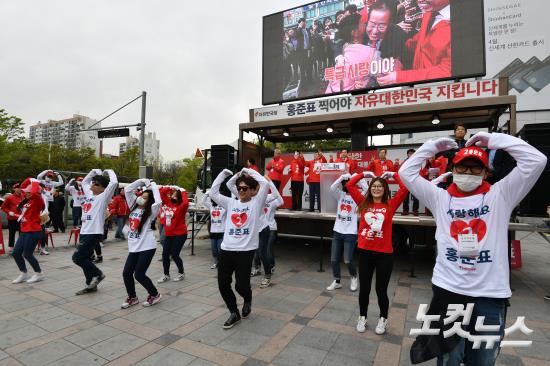 20일 인천종합터미널 광장에서 열린 자유한국당 홍준표 대선후보 거점 유세에 선거운동원들이 손으로 하트를 만들어보이고 있다.