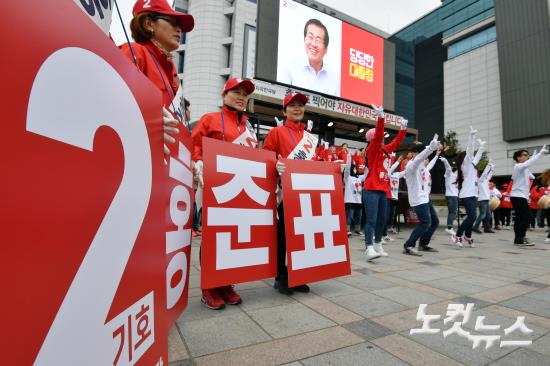 20일 인천종합터미널 광장에서 열린 자유한국당 홍준표 대선후보 거점 유세에 기호 2번 홍 후보의 번호를 든 선거운동원들이 지지를 호소하고 있다.