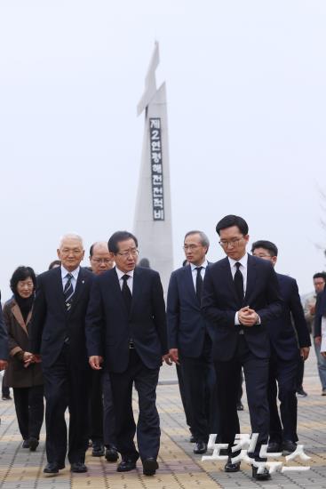 자유한국당 홍준표 대선후보가 20일 오후 경기도 평택 해군2함대 사령부를 방문해 연평해전희생자 참배를 마치고 돌아서고 있다.