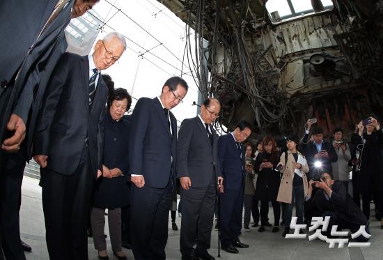 자유한국당 홍준표 대선 후보가 20일 경기도 평택시 해군2함대를 찾아 천안함에서 묵념을 하고 있다.