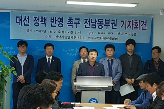 전남시민단체연대회의·여수시민사회단체연대회의(이하 연대회의)는 이같은 현안을 중심으로 20일 오전 11시 여수시 브리핑룸에서 '대선정책 반영 촉구 전남 동부권' 기자회견을 했다.