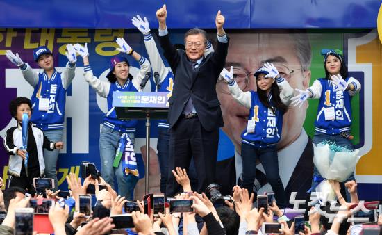 더불어민주당 문재인 대선 후보가 20일 강원 원주 중평길에서 집중 유세를 하고 있다.