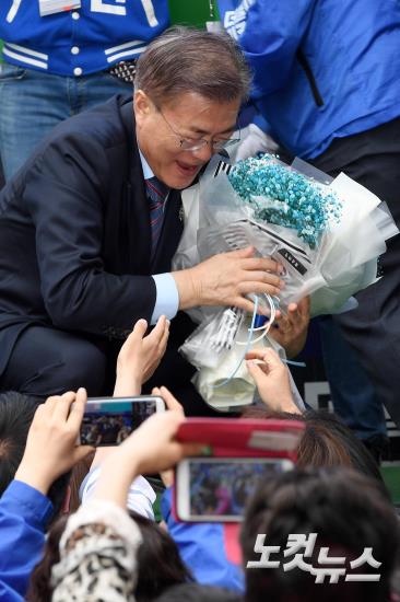 더불어민주당 문재인 대선 후보가 20일 강원 원주 중평길에서 집중 유세를 마친 뒤 지지자들에게 꽃다발을 받고 있다.