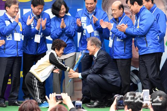 더불어민주당 문재인 대선 후보가 20일 강원 원주 중평길에서 열린 집중 유세에서 '원주의 작은거인' 이금자 씨에게 꽃을 받고 있다.