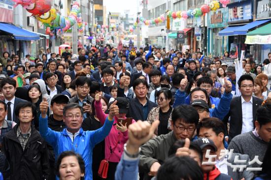 20일 강원 원주 중평길에서 원주시민들이 더불어민주당 문재인 대선 후보의 연설에 환호하고 있다.