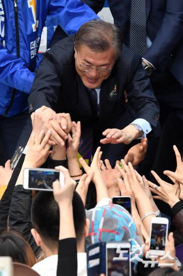 더불어민주당 문재인 대선 후보가 20일 강원 원주 중평길에서 유세를 마친 뒤 시민들과 인사하고 있다.