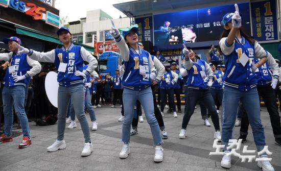 20일 강원 원주 중평길에서 더불어민주당 문재인 대선 후보 유세단이 율동을 하고 있다.