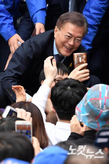 더불어민주당 문재인 대선 후보가 20일 강원 원주 중평길에서 유세를 마친 뒤 한 시민과 기념 촬영을 하고 있다.