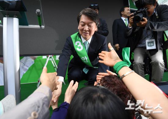 국민의당 안철수 대선후보가 22일 오전 경남 창원시 의창구 읍성로 일대에서 선거유세를 마치고 시민들과 인사를 하고 있다.