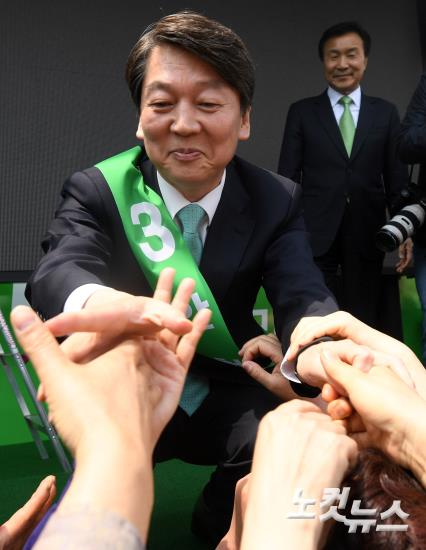 국민의당 안철수 대선후보가 22일 오전 경남 창원시 의창구 읍성로 일대에서 선거유세를 마치고 시민들과 인사를 하고 있다.