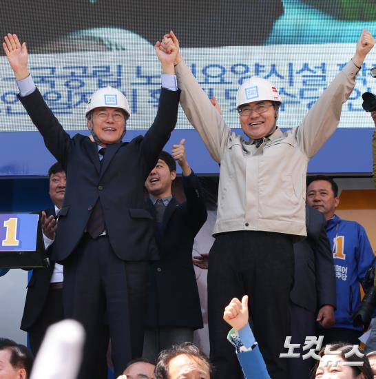 더불어민주당 문재인 대선 후보가 22일 울산 롯데백화점 광장에서 열린 집중 유세에서 안전한 대한민국을 만들어 달라는 의미의 안전모를 쓰고 있다.
