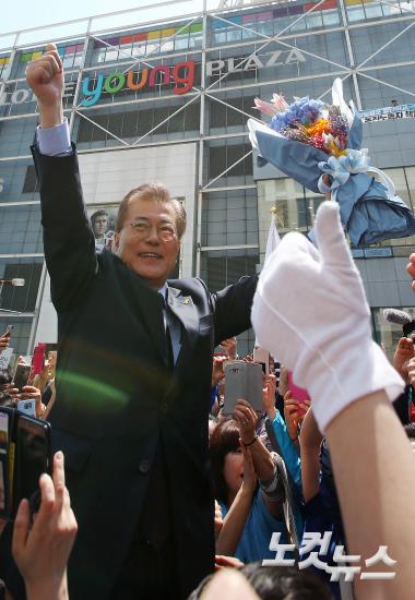 더불어민주당 문재인 대선 후보가 22일 울산 롯데백화점 광장에서 열린 집중 유세에서 지지자들에게 인사하고 있다.