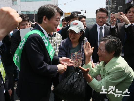 국민의당 안철수 대선 후보가 22일 오전 경남 창원시 의창구 소답시장에서 시민들과 인사를 나누며 지지를 호소하고 있다.