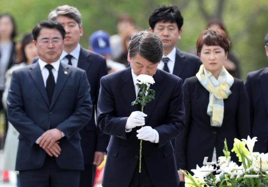 국민의당 안철수 대선후보가 22일 오후 경남 김해시 봉하마을 고 노무현 전 대통령 묘역을 찾아 참배하고 있다.