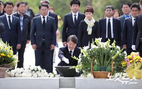 국민의당 안철수 대선후보가 22일 오후 경남 김해시 봉하마을 고 노무현 전 대통령 묘역을 찾아 참배하고 있다.