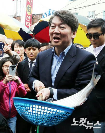 국민의당 안철수 대선 후보가 22일 오후 경남 창원시 마산합포구 마산어시장에서 생선을 들어보고 있다. (안철수 캠프 제공)