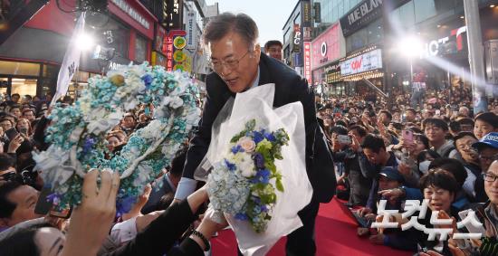 더불어민주당 문재인 대선 후보가 22일 부산 서면 젊음의 거리에서 열린 집중 유세에서 지지자들과 인사하고 있다.