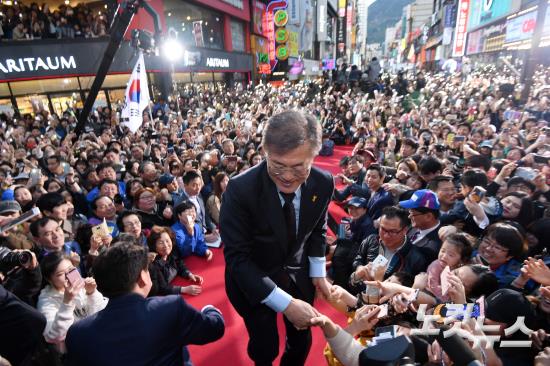 더불어민주당 문재인 대선 후보가 22일 부산 서면 젊음의 거리에서 열린 집중 유세에서 지지자들과 인사하고 있다.