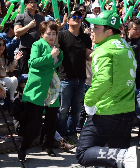 국민의당 이언주 의원이 23일 오후 서울 종로구 세종문회회관 앞에서 열린 국민의당 안철수 대선후보의 ‘국민과의 약속, 대한민국 미래선언’ 행사에서 율동을 선보이고 있다.