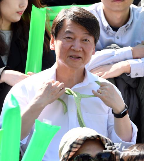 국민의당 안철수 대선후보가 23일 오후 서울 종로구 세종문회회관 앞에서 열린 ‘국민과의 약속, 대한민국 미래선언’ 행사 도중 넥타이를 풀고 있다.