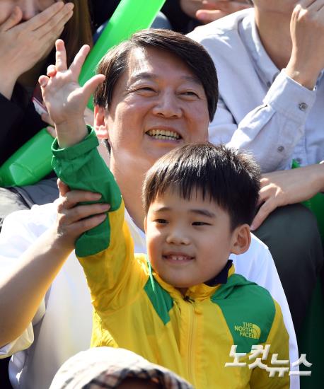 국민의당 안철수 대선후보가 23일 오후 서울 종로구 세종문회회관 앞에서 열린 ‘국민과의 약속, 대한민국 미래선언’ 행사에서 한 어린이와 함께 미소를 짓고 있다.