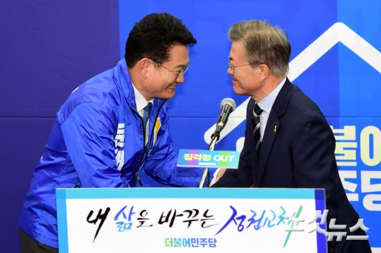 송영길 선대위 총괄본부장과 악수하는 문재인 대선후보