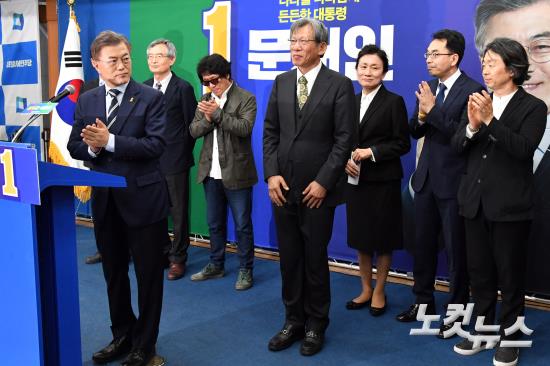 더불어민주당 문재인 대선후보가 24일 오후 여의도 당사에서 열린 '서울역사문화벨트조성공약 기획위원회', '광화문대통령공약 기획위원회' 출범 기자회견에서 위원장으로 선임괸 유홍준 전 문화재청장을 소개하고 있다.