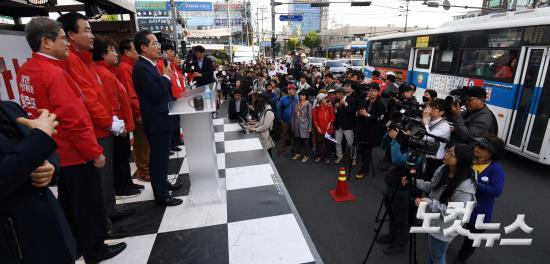 자유한국당 홍준표 대선후보가 24일 오후 경기도 구리 수택동 돌다리사거리에서 시민들을 향해 지지를 호소하고 있다.
