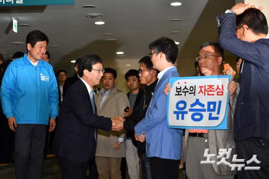 의총 참석하며 지지자들과 인사하는 유승민