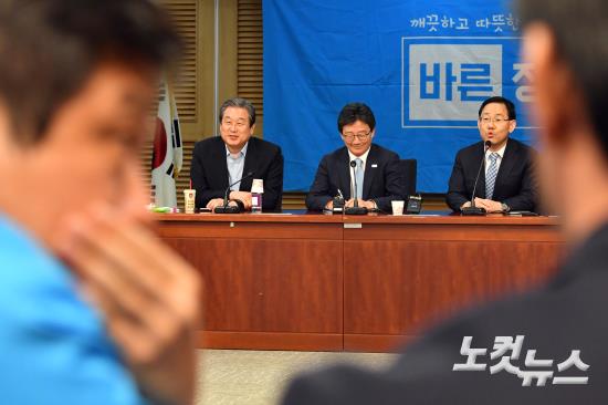 바른정당 유승민 대선후보가 24일 오후 국회 의원회관에서 자신의 거취 등을 논의하는 의원총회에 참석해 밝은 표정을 짓고 있다.(좌측 김무성 상임중앙선대위원장)