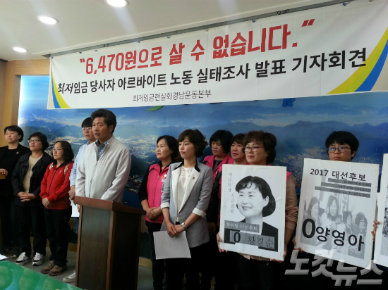 최저임금현실화경남운동본부는 24일 창원시청에서 '최저임금 당사자 아르바이트 노동 실태조사 결과 발표' 기자회견을 열고 "차기 대통령선거에 출마한 후보들은 시점은 다르지만 저마다 시급 1만 원에 대해서는 한 목소리를 내고 있다"며 "최저임금 당사자들의 현실과 그들의 요구를 대선 후보들은 들어야 한다"고 발혔다.