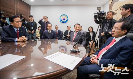 자유한국당 홍준표 대선후보가 25일 오전 서울 마포구 대한재향경우회 사무실을 방문해 구재태 회장(맨 왼쪽)등 회원들과 대화를 하고 있다.