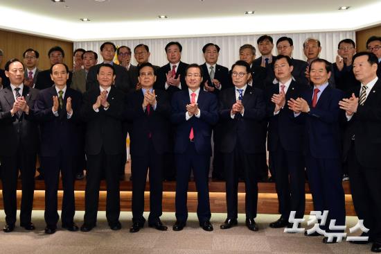 자유한국당 홍준표 대선후보가 25일 오전 서울 마포구 대한재향경우회 사무실을 방문해 구재태 회장 등 회원들과 포즈를 취하고 있다.