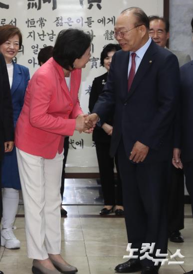이심 대한노인회장과 인사하는 김정숙 여사