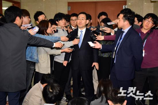바른정당 주호영 원내대표가 25일 국회 정론관에서 전날 열린 유승민 대선후보의 거취 등을 논의한 의원총회에 대해 설명을 하고 취재진의 질문을 받고 있다.