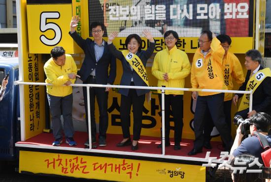 정의당 심상정 대선 후보가 27일 오후 서울 성신여대 앞에서 유세를 하고 있다.