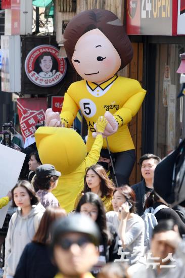 정의당 심상정 대선 후보가 27일 오후 서울 성신여대 앞에서 유세를 하고 있다.