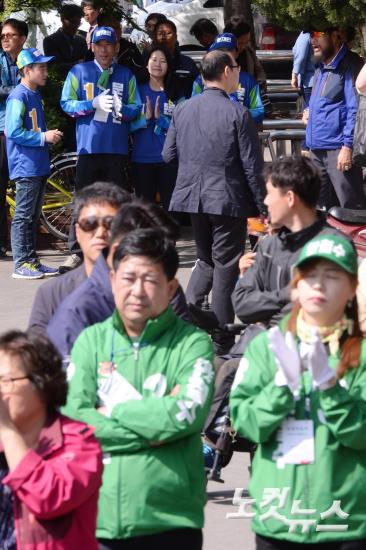 국민의당 안철수 대선후보의 27일 오후 경북 경주시 경주역 광장에서 유세장에서 그늘아래 문재인 운동원들이 안후보의 연설에 박수를 보내며 바라보고 있다.