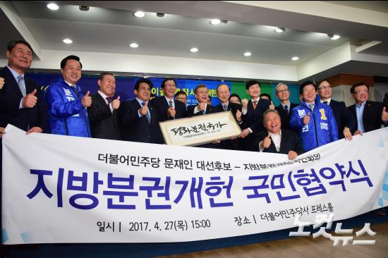 더불어민주당 문재인 대선후보가 27일 여의도 당사에서 [내 삶을 바꾸는 정권교체] 정책시리즈 21-'전국이 골고루 잘 사는 대한민국'자치분권정책 발표 및 지방분권 개헌 국민협약식에서 이기우 지방분권 개헌 국민행동 상임의장으로부터 액자를 선물 받고 포즈를 취하고 있다.