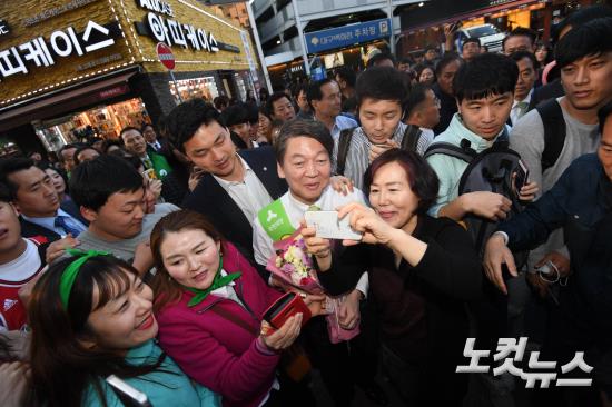 국민의당 안철수 대선후보가 27일 오후 대구 동성로 대구백화점 인근에서 선거유세를 마치고 시민들과 기념촬영을 하고 있다.