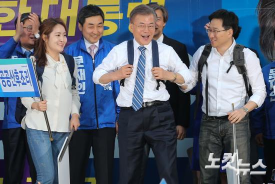 더불어민주당 문재인 대선 후보가 27일 오후 경기도 성남시 야탑역 광장에서 열린 집중유세에서 성남시 대표정책을 전달 받는 퍼포먼스를 하고 있다.