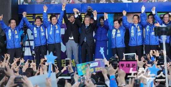 더불어민주당 문재인 대선 후보가 27일 오후 경기도 성남시 야탑역 광장에서 열린 집중유세에서 이종걸 공동선대위원장, 조국 서울대 교수 등과 함께 인사하고 있다.