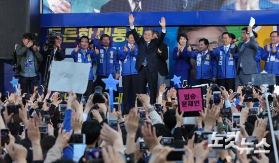 더불어민주당 문재인 대선 후보가 27일 오후 경기도 성남시 야탑역 광장에서 열린 집중유세에서 지지자들의 환호에 화답하고 있다.