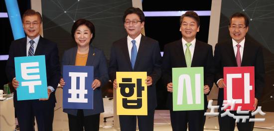 더불어민주당 문재인(왼쪽부터), 정의당 심상정, 바른정당 유승민, 국민의당 안철수, 자유한국당 홍준표 대선후보가 28일 오후 서울 상암동 MBC 스튜디오에서 선거관리위원회 주최로 열린 생방송 토론을 시작하기 앞서 투표참여 독려 피켓을 들고 있다. (국회사진취재단)