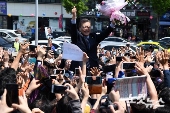 익산 지지자들에게 인사하는 더불어민주당 문재인 후보